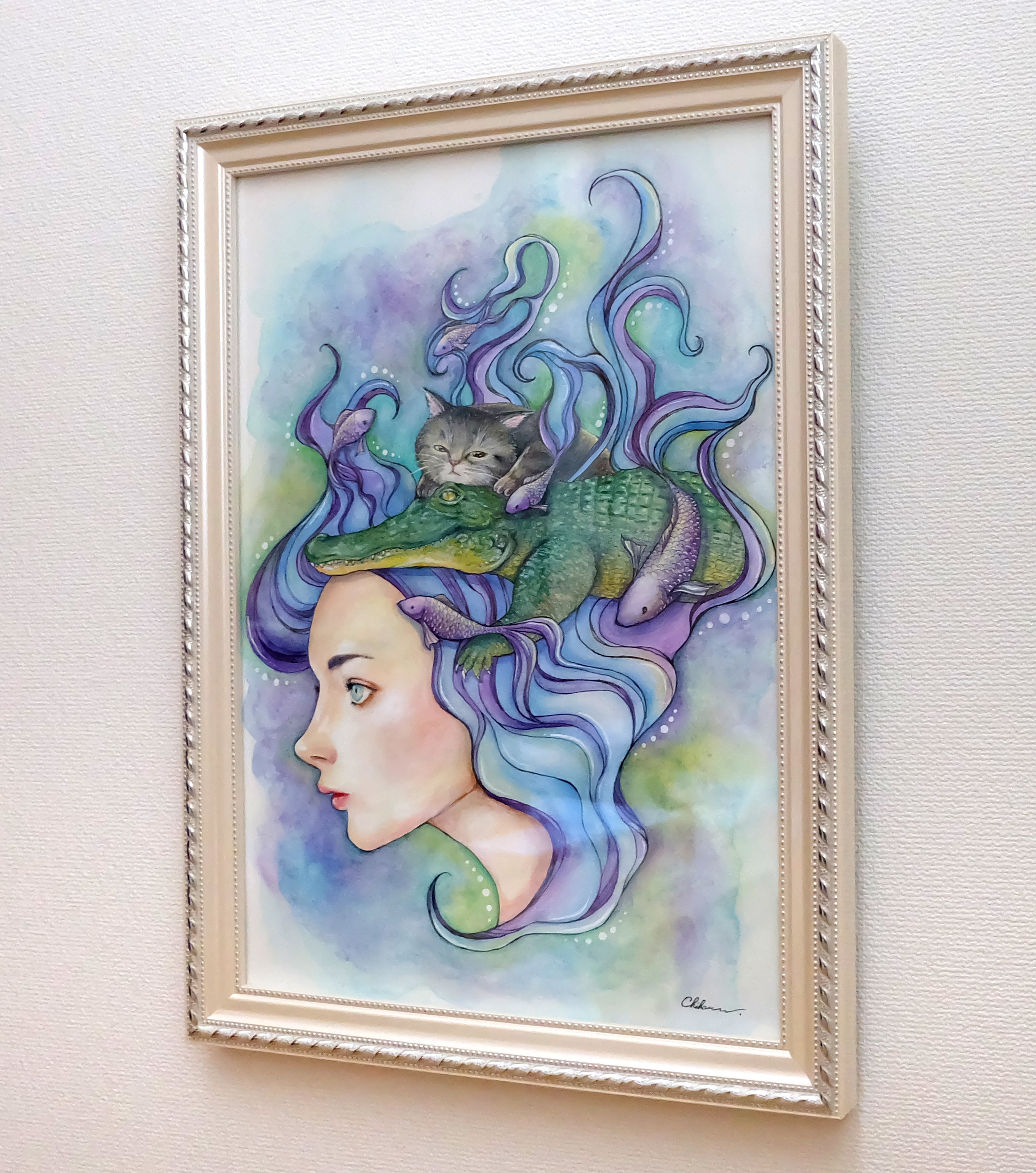 アクリル画、水彩画、デジタル画など色々な画材で描き、描き方も写実的な絵とゆるいオリジナルキャラクター「おこにゃん」と全く別の方が描いたのかと思わせるchiharuさん。