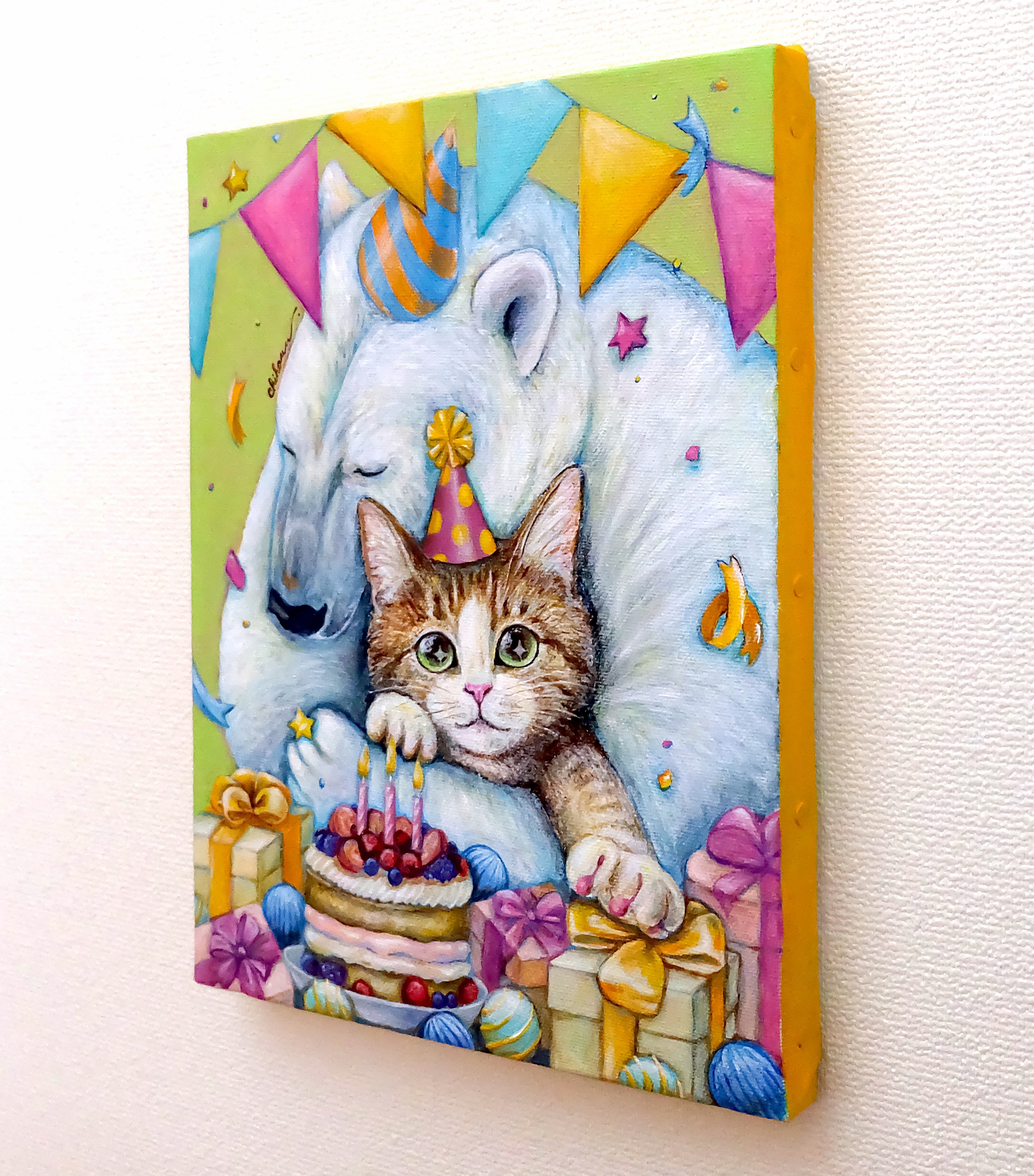 アクリル画、水彩画、デジタル画など色々な画材で描き、描き方も写実的な絵とゆるいオリジナルキャラクター「おこにゃん」と全く別の方が描いたのかと思わせるchiharuさん。