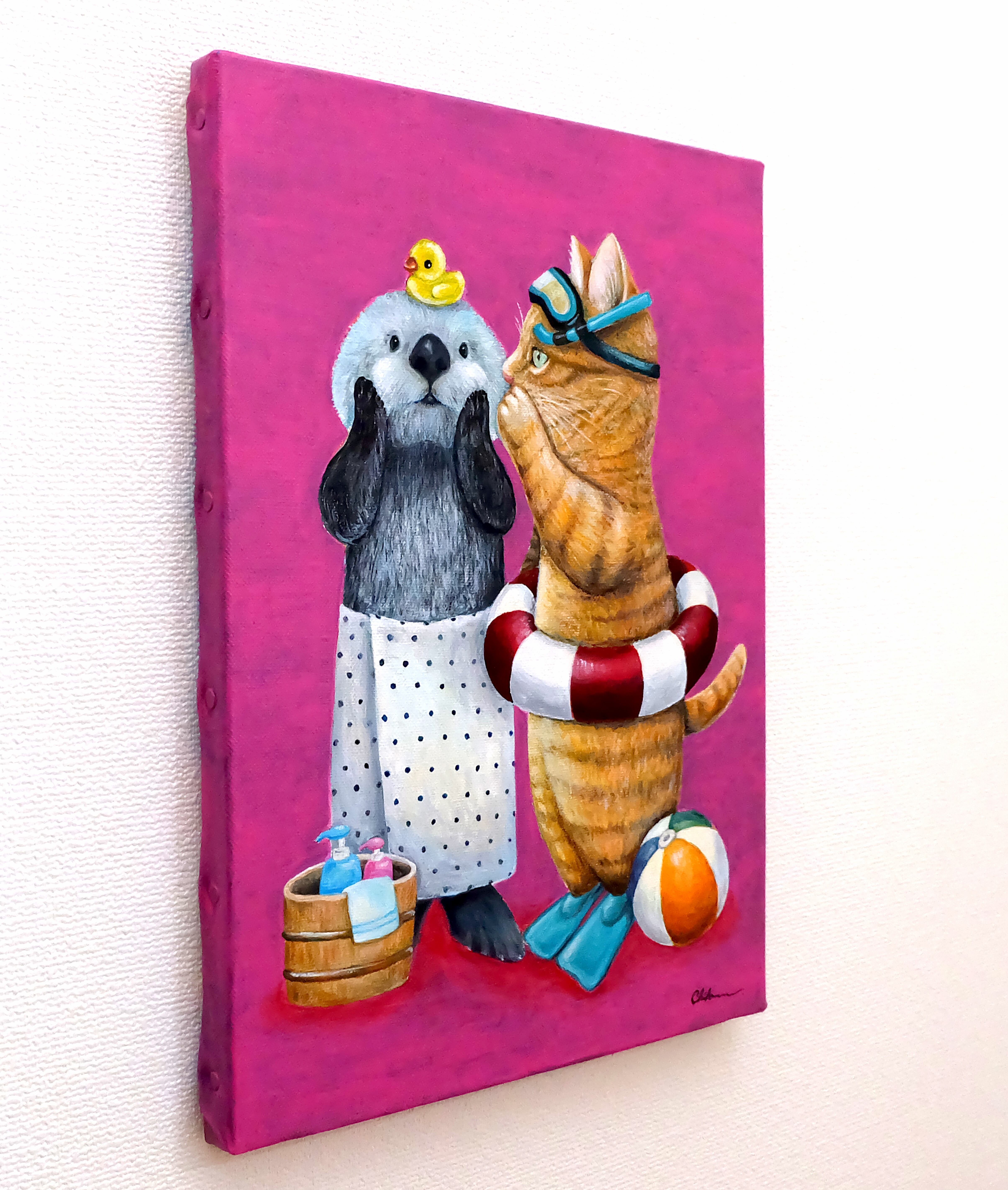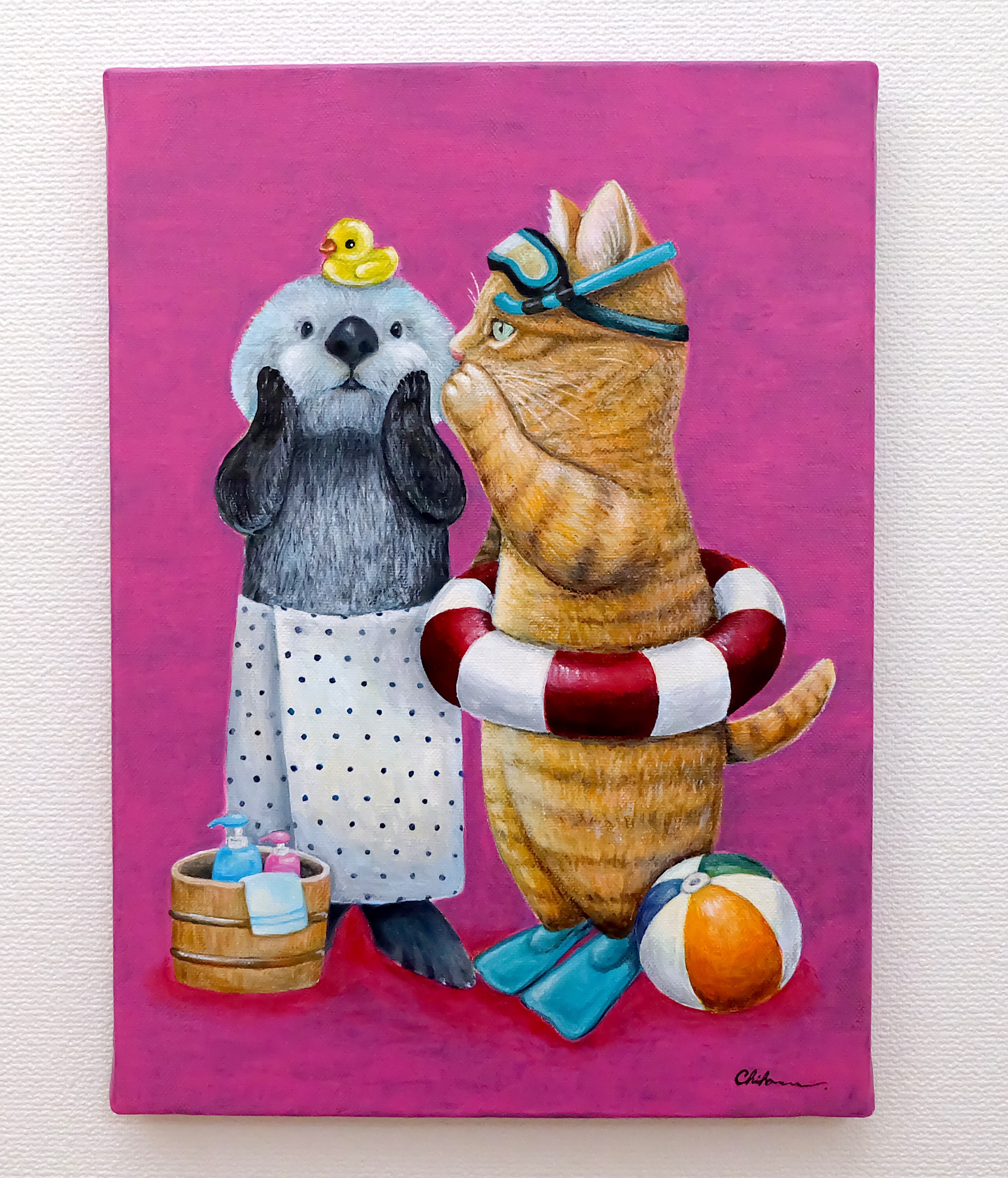 アクリル画、水彩画、デジタル画など色々な画材で描き、描き方も写実的な絵とゆるいオリジナルキャラクター「おこにゃん」と全く別の方が描いたのかと思わせるchiharuさん。
