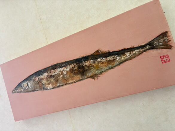 秋の醍醐味!サンマです!!箔は長らく使っていなかったのですが、今回久しぶりに銀箔を使ってみました。金属なので存在感が強い箔ですが、学生時代よりも『絵の具の一部』として自由に銀箔を扱えたような気がします!