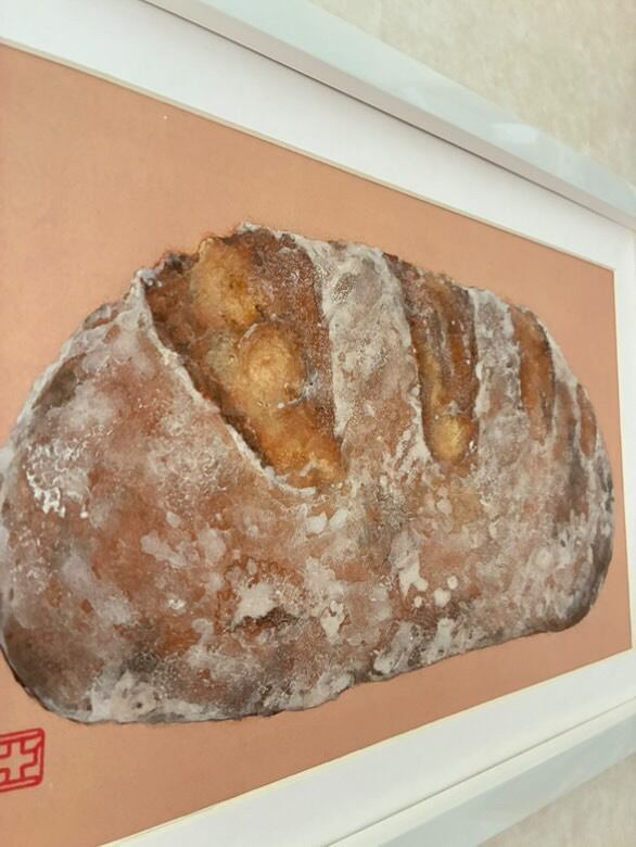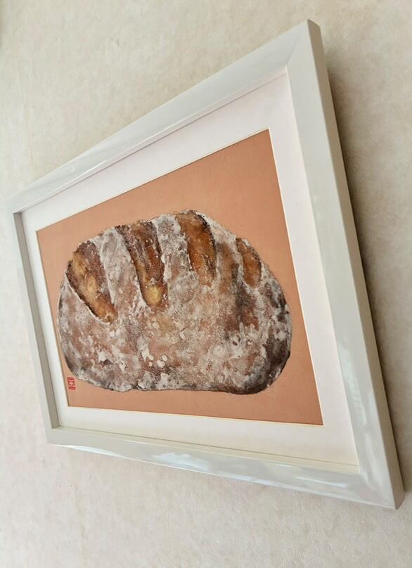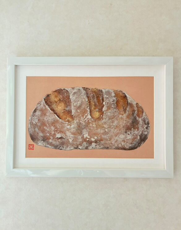 大好きなパン屋さんの大きなパンです!大きなサイズのパンを描くようになってから、背景に紅茶をした塗りで使うようになりました。紅茶の赤みのある茶色がお気に入りなことと、紅茶のタンニンと滲み留めのドーサ(ミョウバンと膠の水溶液)の成分が反応して、黒い斑点が出るのが小麦の雰囲気とよく合っているように感じて使っています!岩絵の具の絵肌感たっぷりのお気に入りの作品です!