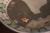 手書きで彫りこんだ絵柄に金を焼き付けた壁掛けのうつわ。