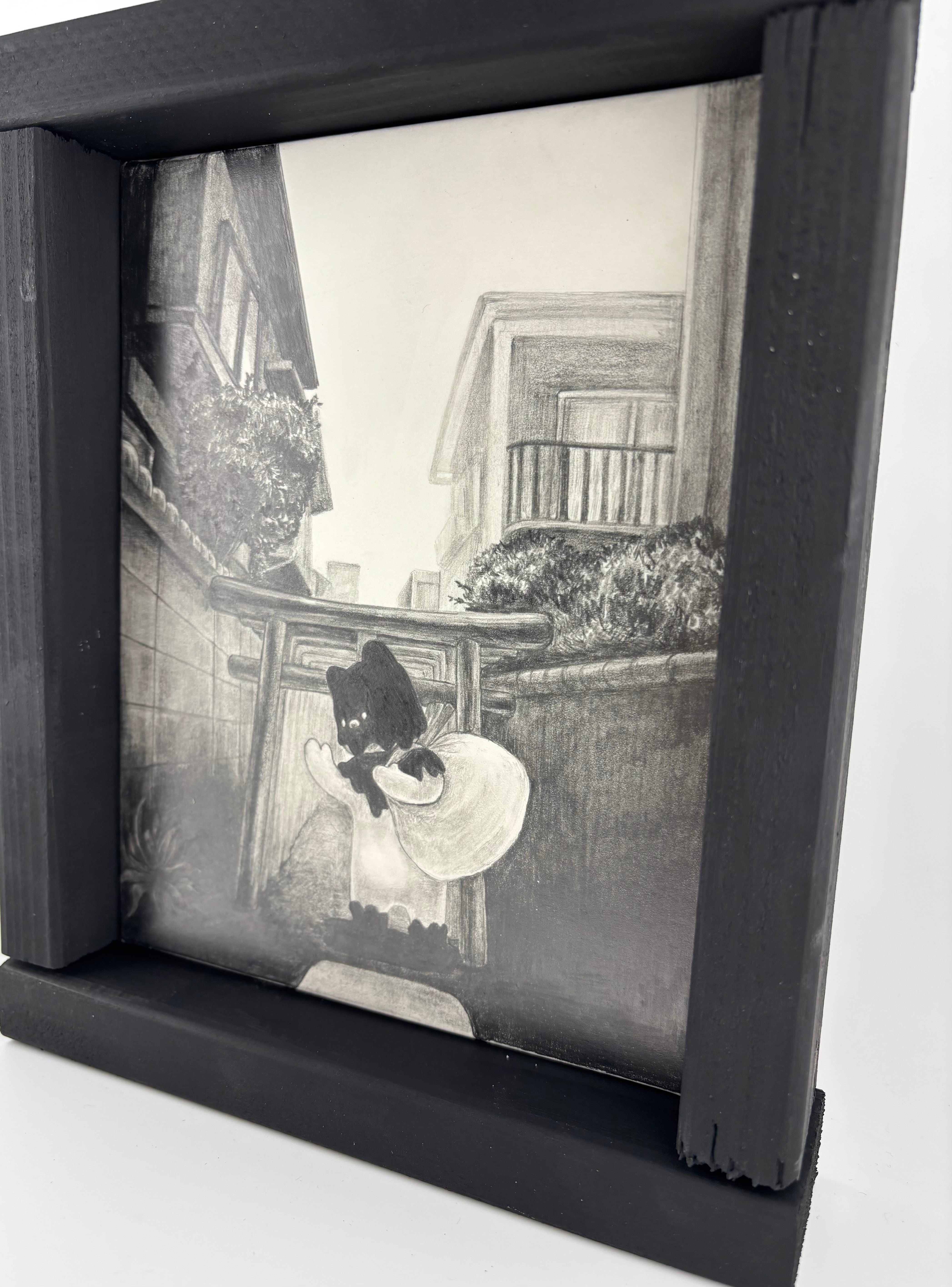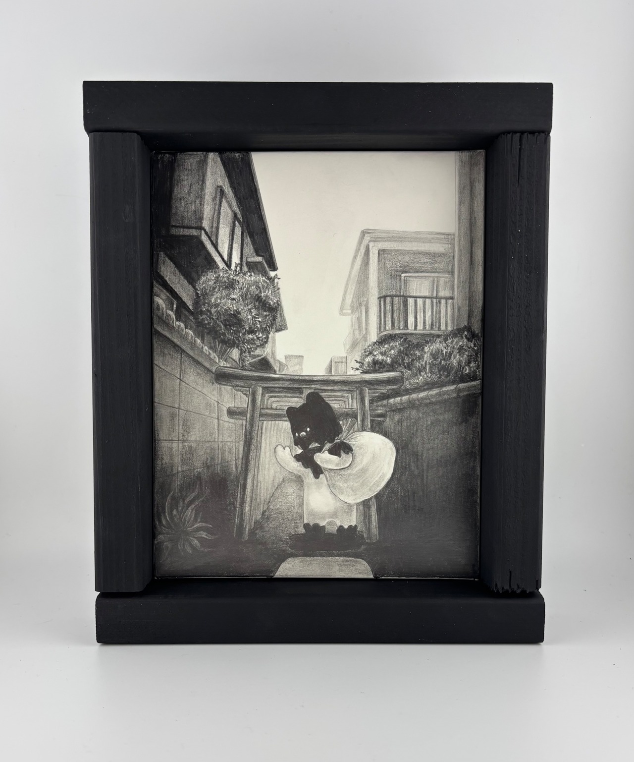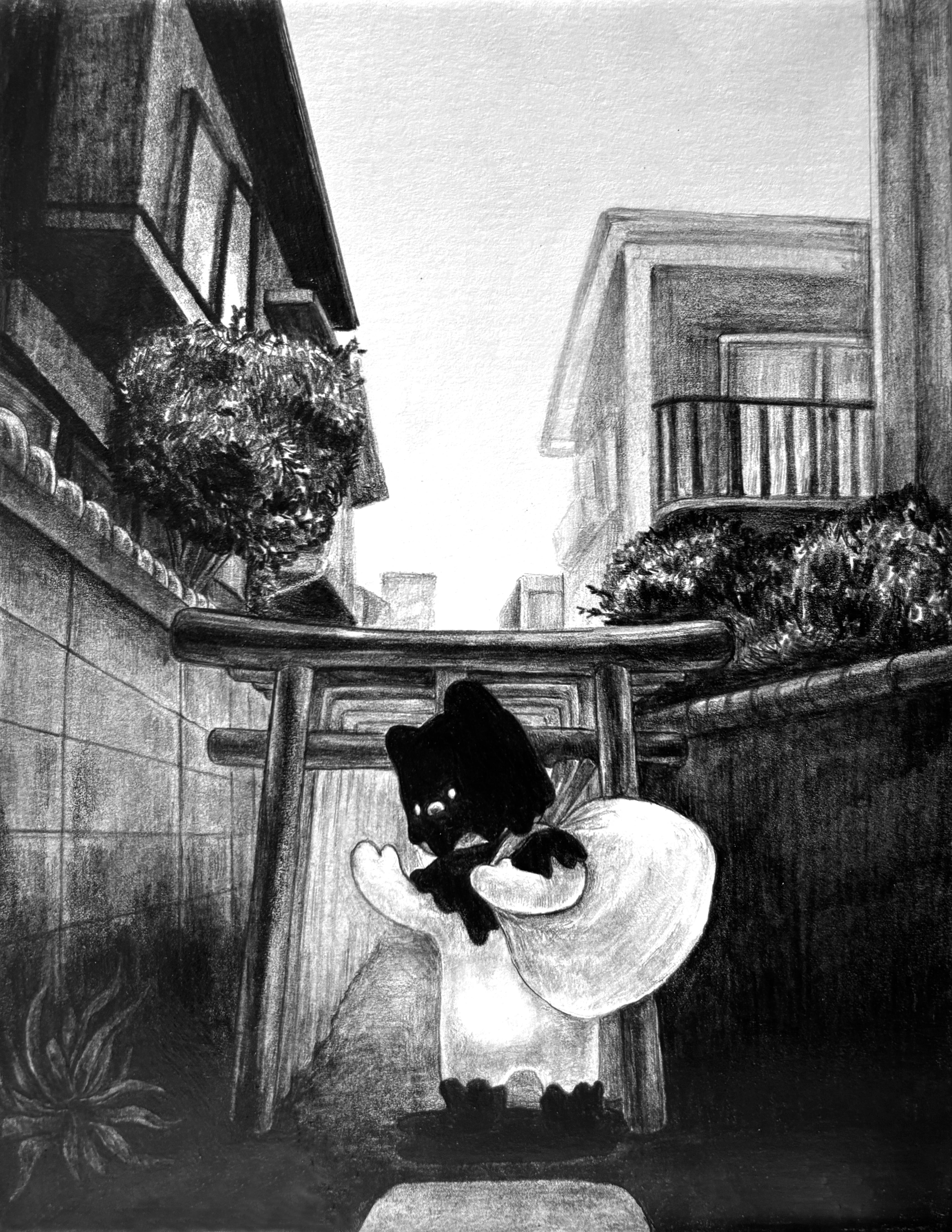 沢山のお買い物をして、エコバッグはぱんぱん。猫の商店街から、ご近所まで帰る鳥居は、大きいサイズからどんどん小さくなっていきます。無事に帰る事は出来るでしょうか。