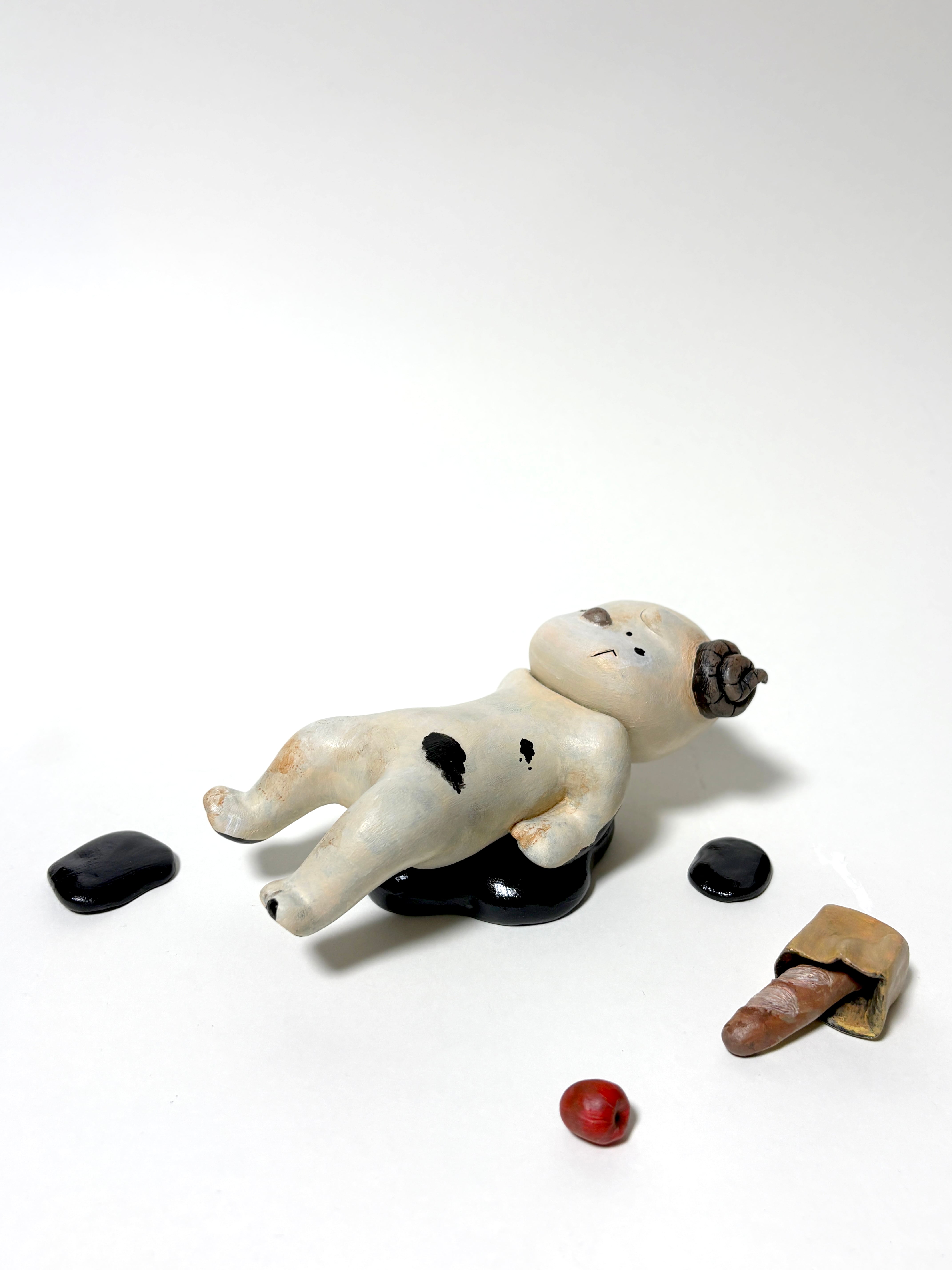 何故か解らないのですが、ポポはお買い物の帰りに転んでしまいました。本当に不思議です。大人が転ぶ迫力と気まずさを含んだ空気感を出したいなぁ、と思い手足のやり場の無い感じをこだわって作りました。