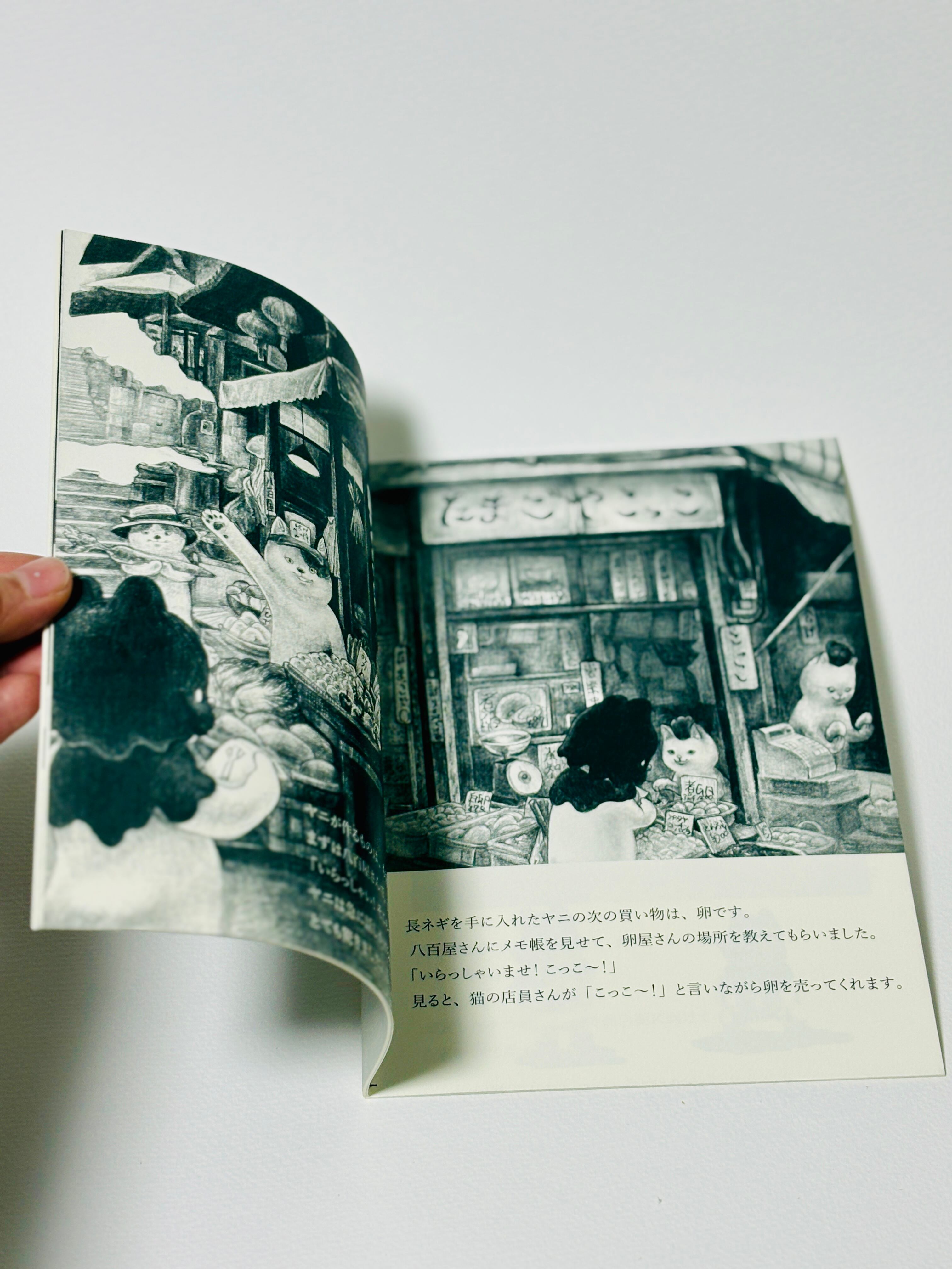 しかし、冷蔵庫の中は空っぽです。慣れないながらも、ヤニは商店街へお買い物へ出かけます。