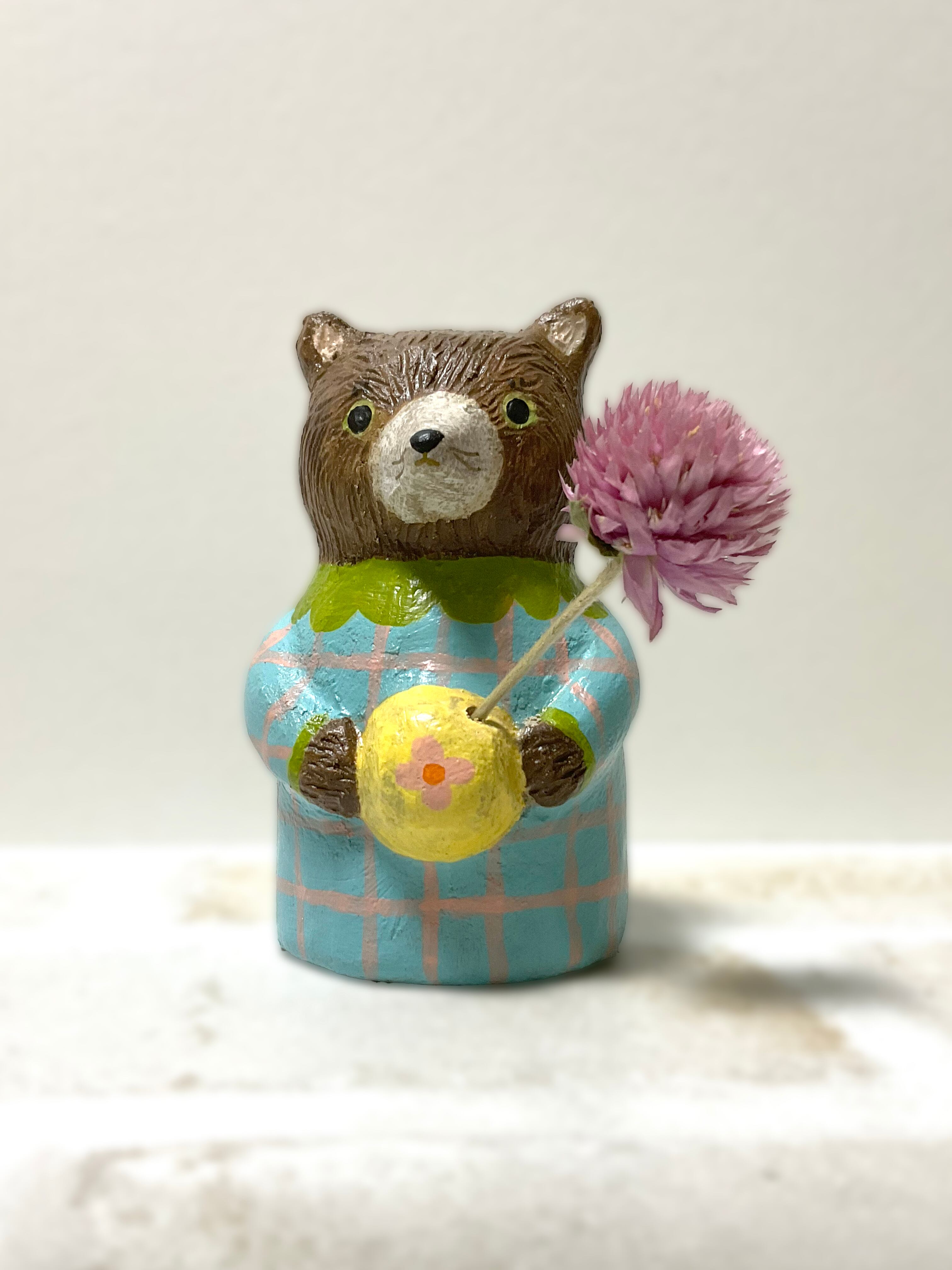 それぞれの手に持った花瓶にドライフラワーを一輪挿して飾ることができます。