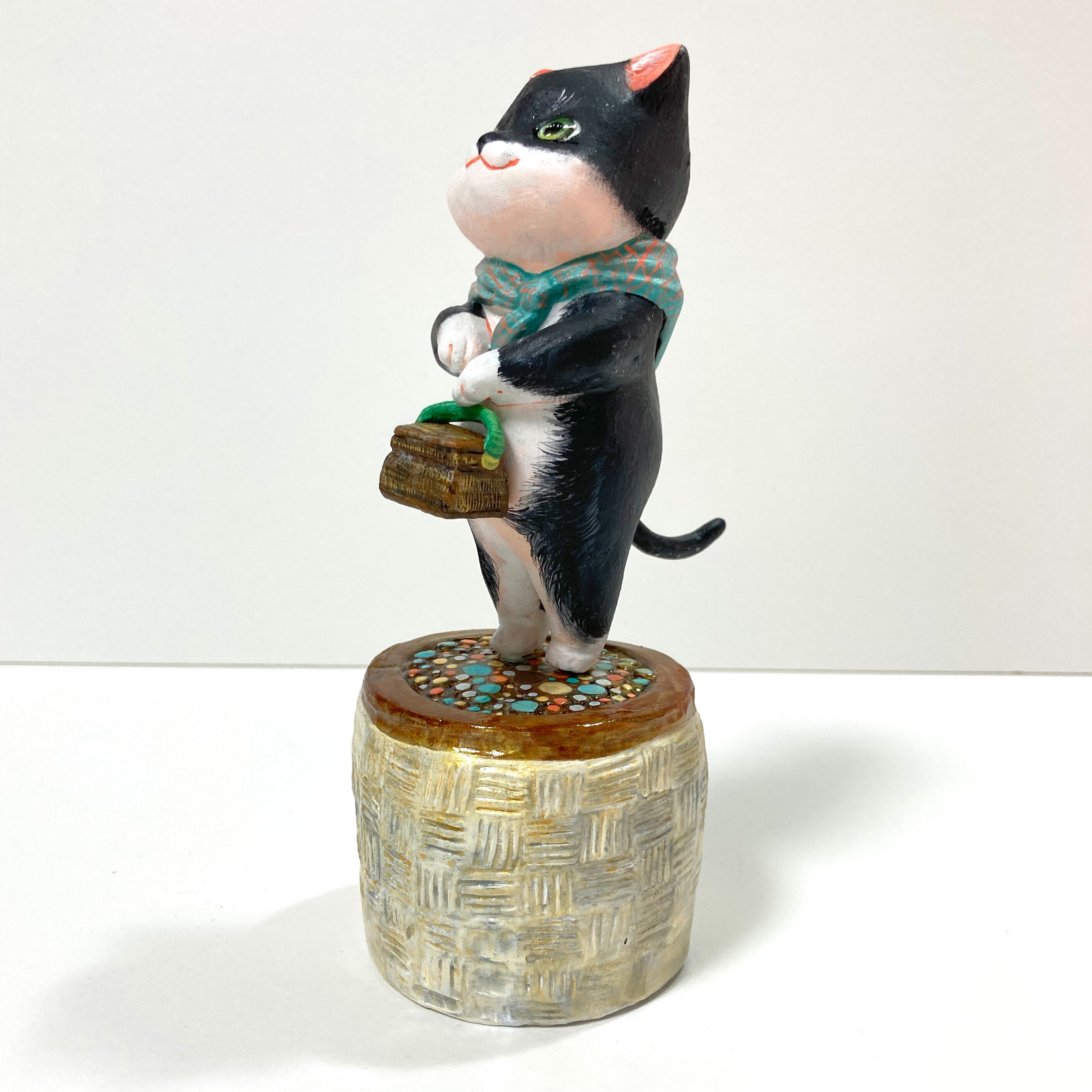 籠のバッグを持ってピクニックへ行く事が憧れだった猫です。念願叶い、飼い主にお弁当を入れてもらい、ピクニックポイントを探している最中です。