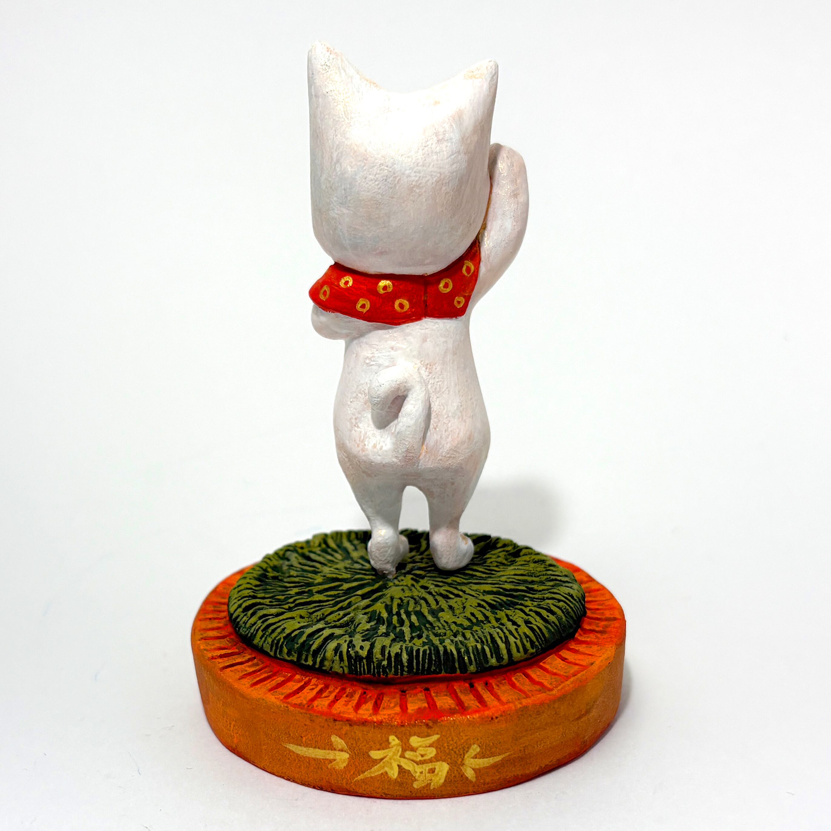 しっとりした芝の上に立つ白猫の招き猫です。素足で芝の上に立つ時、自然を体で実感する時、穏やかな時間を持てると思っています、穏やかな時間が持てるよう願い制作しました。